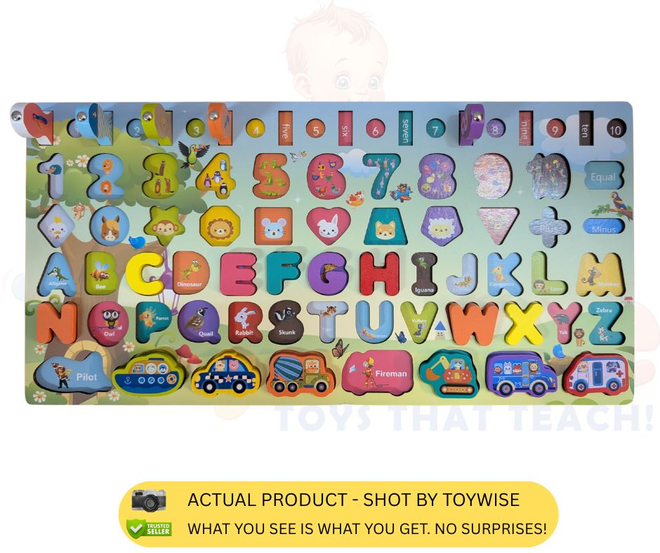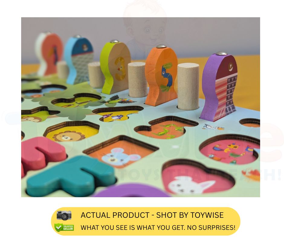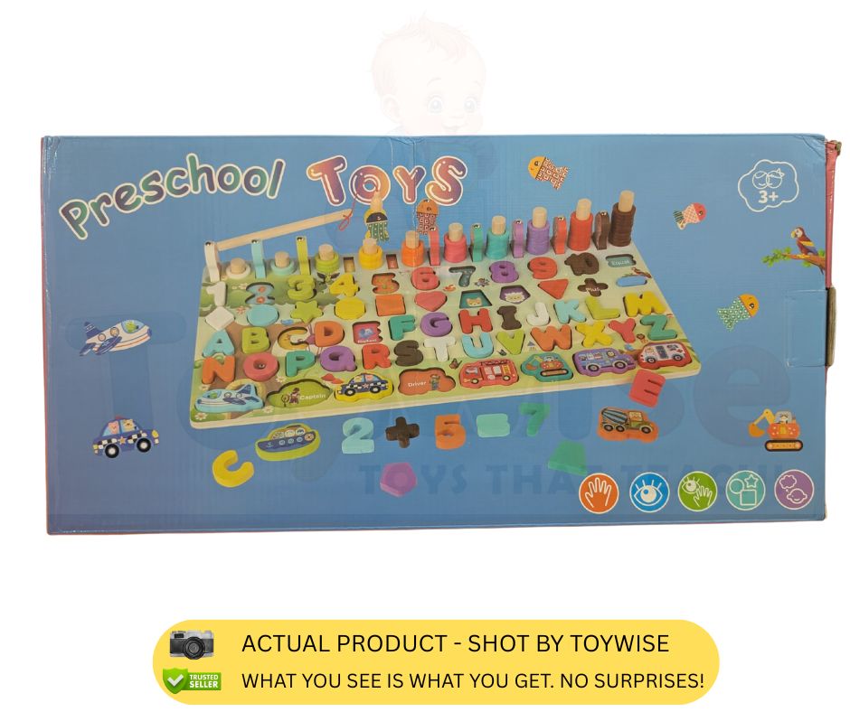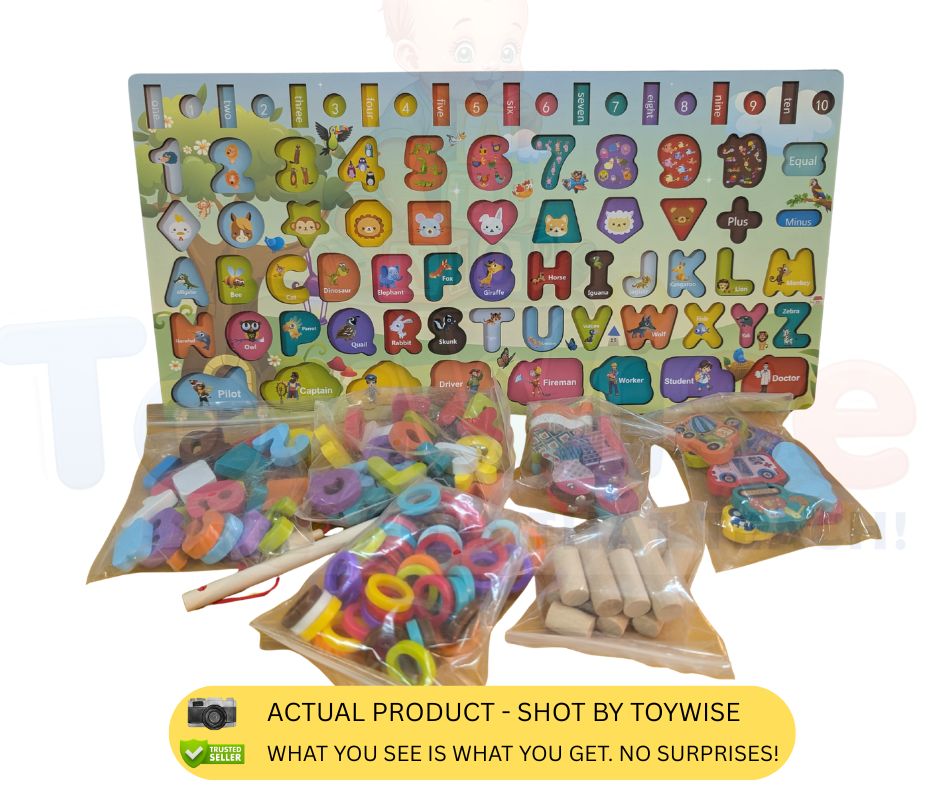 A colorful, multi-functional wooden board packed with 6 engaging learning activities — including fishing game, alphabet, numbers, cars, rings, and shapes. Designed to spark curiosity, build skills, and provide endless Montessori-style fun for kids ages 3 to 8.