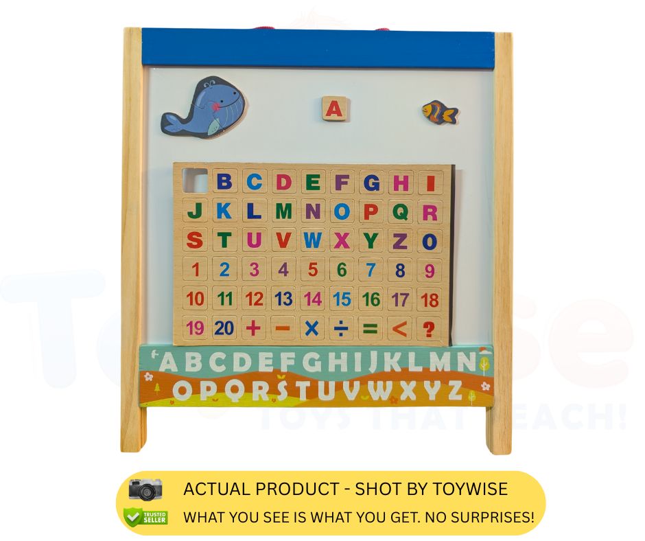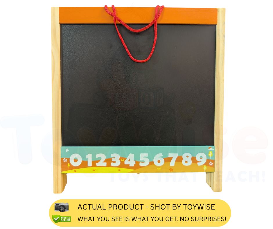 The reverse is a chalkboard (blackboard) — perfect for doodling, writing practice, or creative expression with chalk.