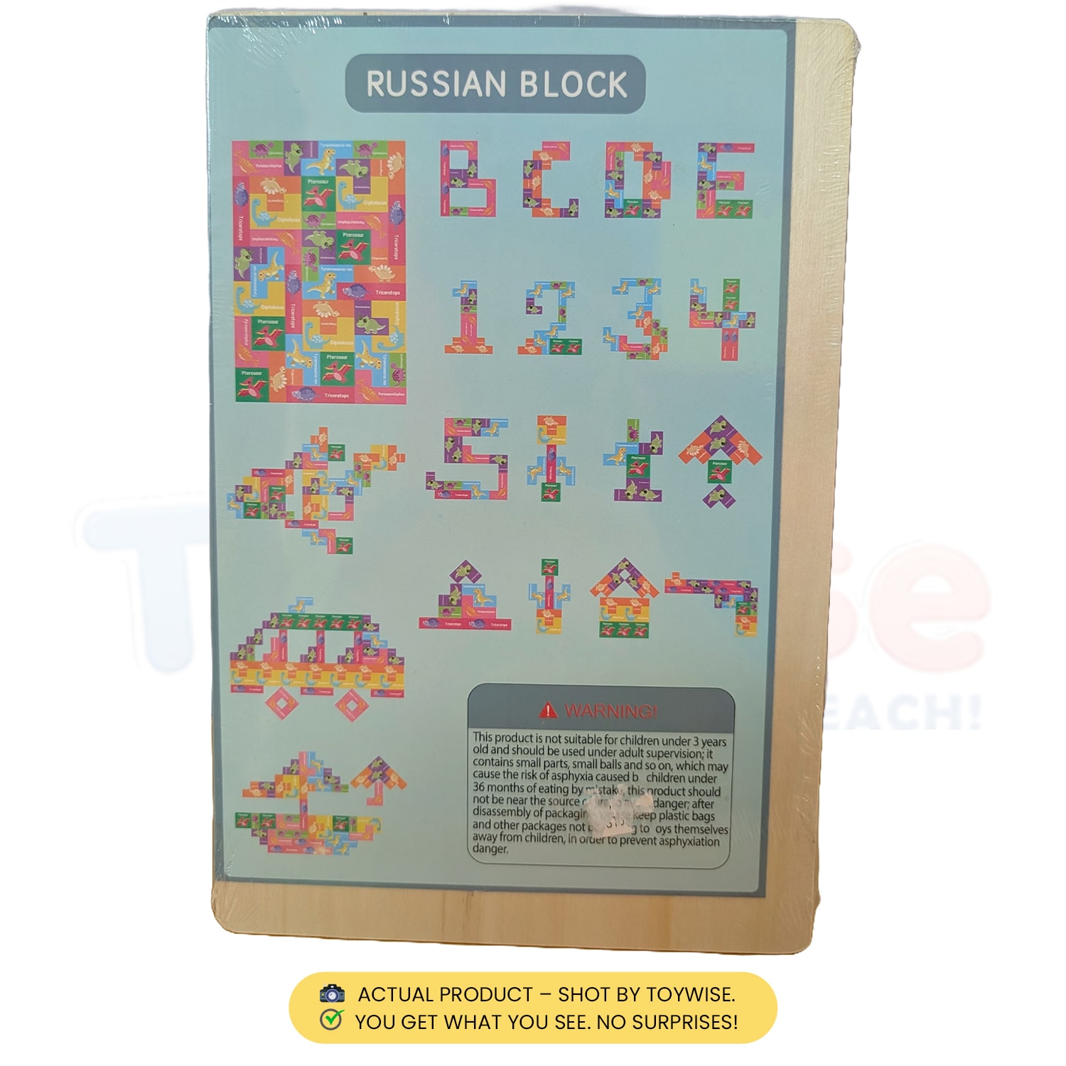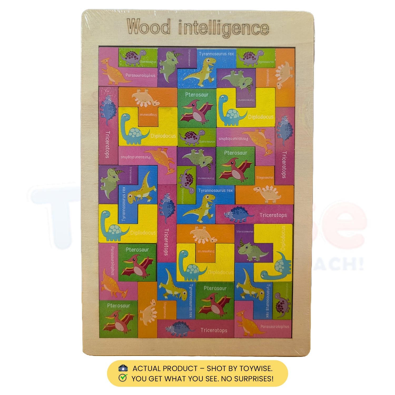 Each puzzle set features a unique theme, with printed shapes and characters (like dinosaurs) on every piece, making it fun and educational. The goal? Fit all pieces back into the wooden frame — no gaps left!