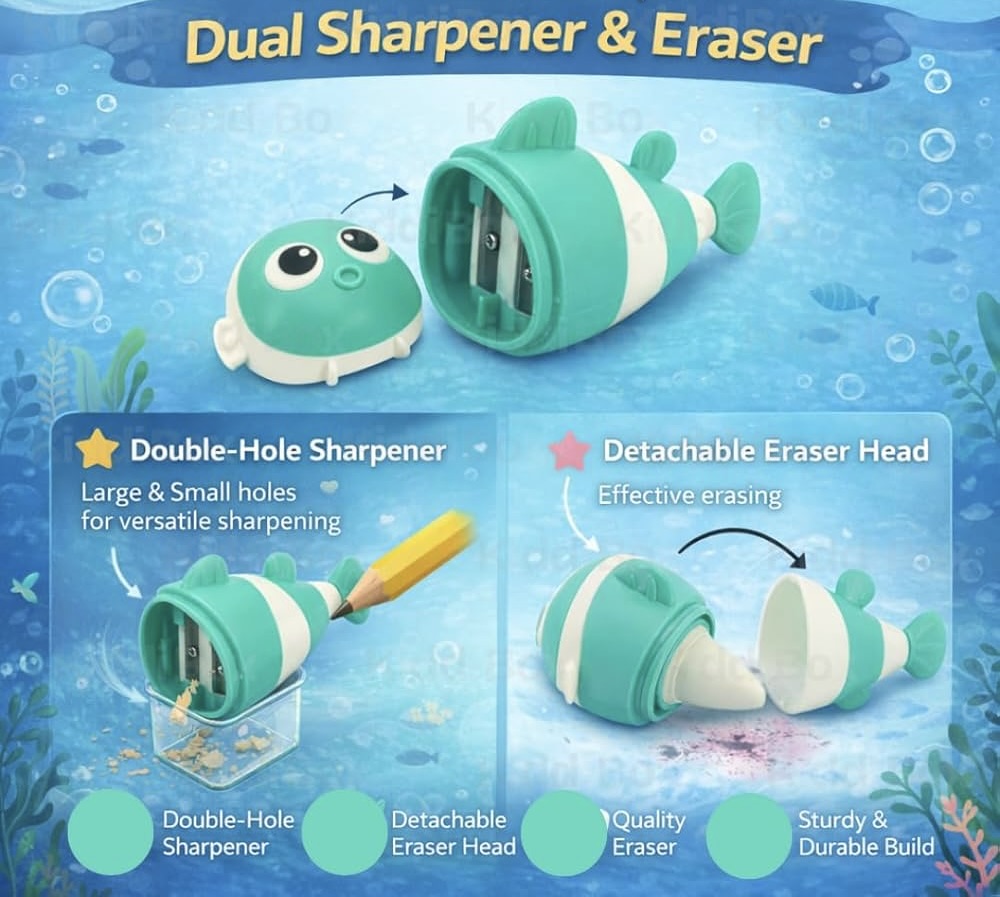 Add excitement to everyday school supplies with the Yalong Fish-Shaped Dual Sharpener & Eraser. Its playful design makes sharpening pencils and fixing mistakes fun for kids.